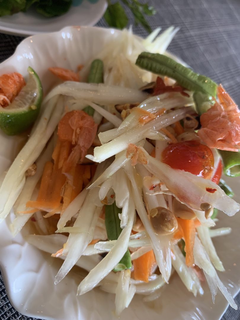 ソムタムは青いパパイヤを使ったサラダです。タイへ旅行へ行くのは5〜6度目なんですがこの日初めて知ったのが、ソムタムがタイの代表的な料理だそうです。日本人にはあまり馴染みがないのではないでしょうか?